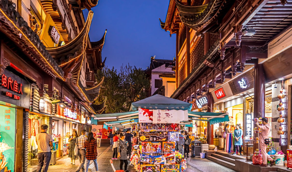 중국 상하이 황푸구 예원 주변 전통 상업 지구, 전통 건축과 활기찬 쇼핑 거리 풍경