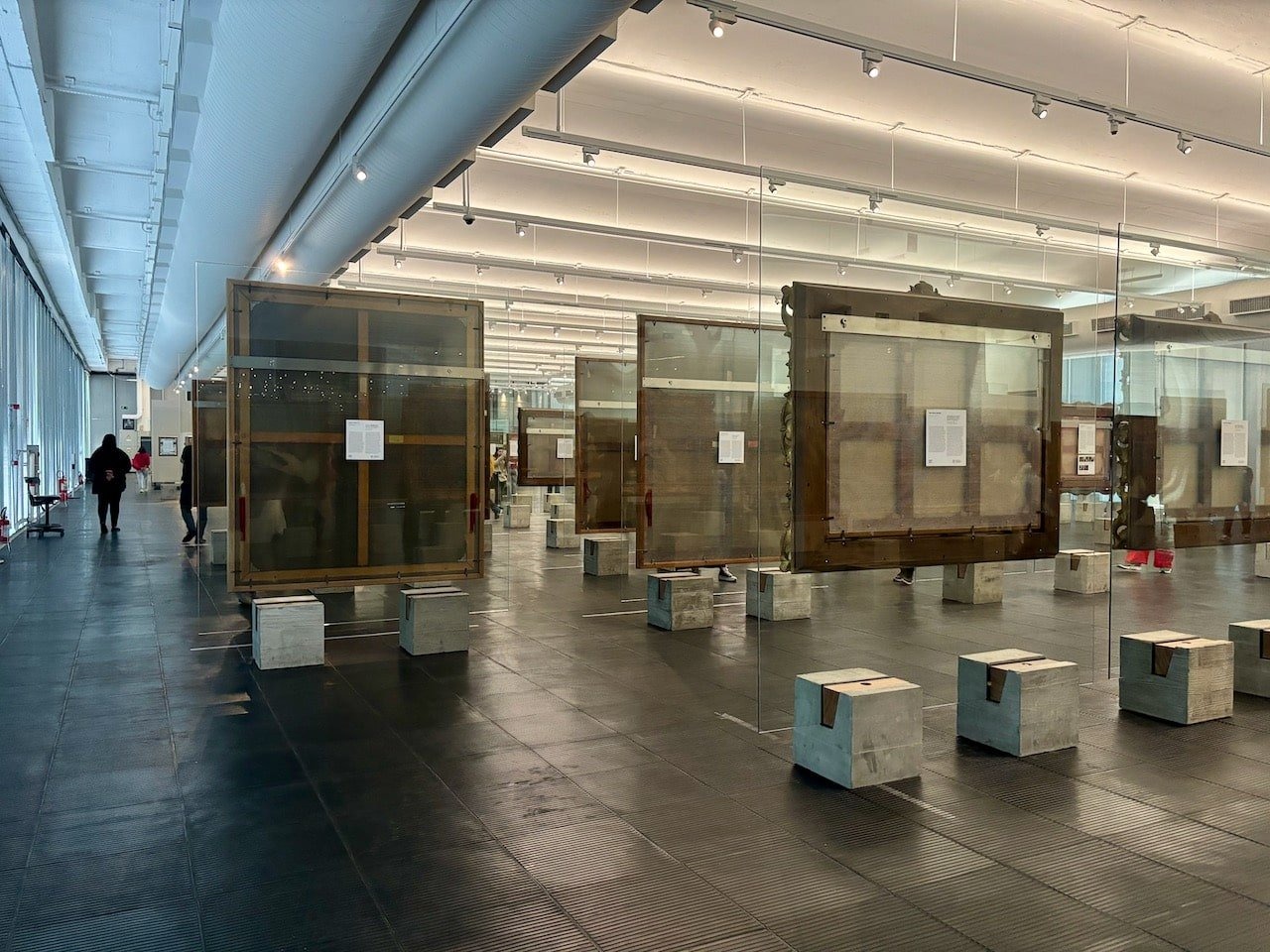 건물을 떠받치는 거대한 빨간 기둥들은 콘크리트와 철골로 만들어졌다고 하는데, 그 육중한 무게를 지탱하면서도 전체적인 구조를 시원하고 가볍게 보이게 만드는 역할을 하고 있었어요. 이 기둥들 덕분에 미술관이 마치 하늘에 떠 있는 듯한 착시를 일으키는 거죠. 저도 모르게 여러 각도에서 사진을 찍으며 이 건축물 자체를 즐겼습니다. 건물의 외벽은 유리로 되어 있어서 내부가 살짝 보이는데, 밖에서 보이는 그 모습만으로도 예술 작품들이 가득한 공간에 대한 기대감을 최고조로 끌어올렸어요. 내부로 들어서면 또 다른 건축적 놀라움이 기다리고 있었는데, 바로 투명한 유리 이젤에 그림을 전시하는 방식이었어요. 이것 또한 보 바르디가 고안해 낸 거라고 해요. 벽에 걸린 그림에 익숙한 저에게는 정말 신선한 충격이었죠. 그림들이 마치 공중에 떠 있는 것처럼 보이면서, 작품 뒤의 여백까지도 감상할 수 있게 해주더라고요. 뭐랄까, 작품 하나하나가 숨을 쉬고 있는 것처럼 느껴진다고 할까요? 작품을 자유롭게 배치하고, 벽에 가두지 않음으로써 관람객이 작품과 더욱 친밀하게 교감할 수 있도록 한 보 바르디의 철학이 곳곳에서 느껴지는 것 같았어요.