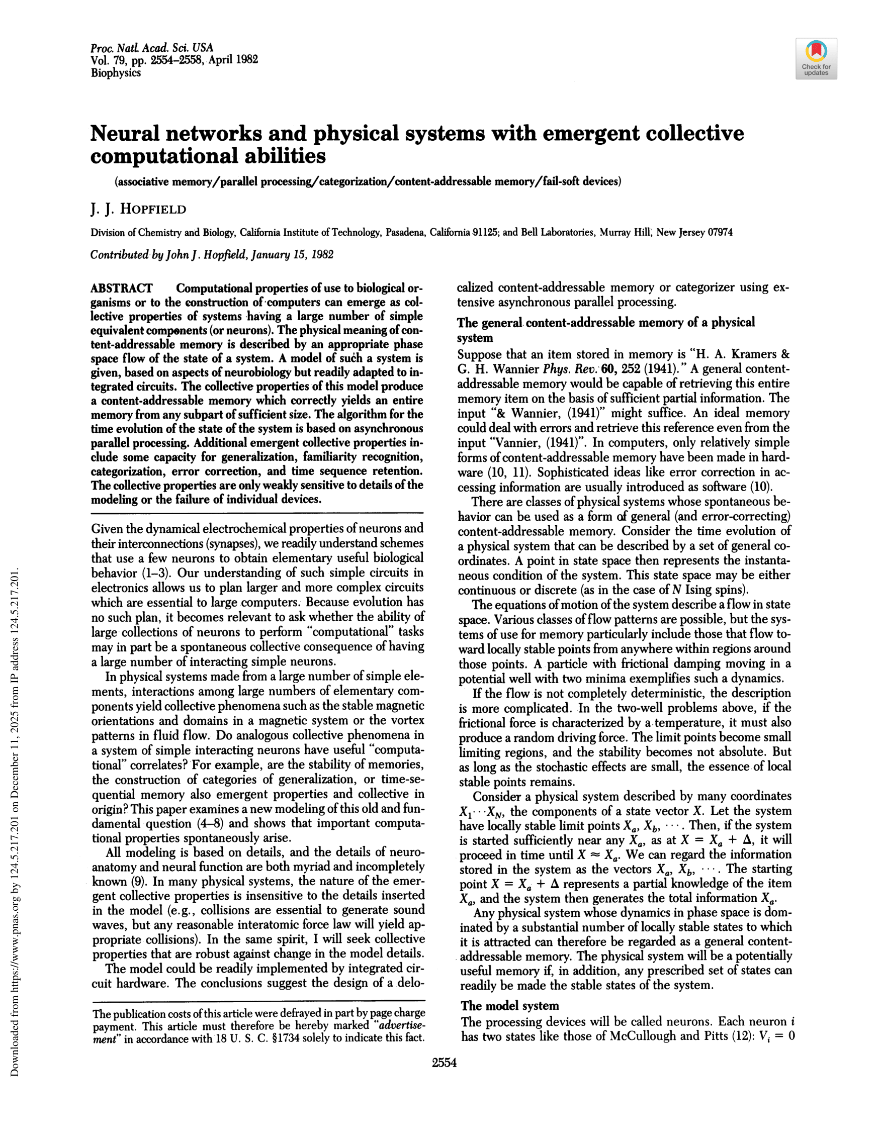 이 섹션의 제목처럼, 홉필드는 개별 뉴런의 단순한 상호작용이 어떻게 집단적 계산 기능을 창발(emerge)시키는지 논합니다. 개별 뉴런은 그저 자신의 입력 합에 따라 상태를 결정하는 단순한 규칙만 따르지만, 이 수많은 뉴런들이 대칭적인 연결을 통해 에너지를 최소화하는 방향으로 동시에 움직일 때, 비로소 연상 기억, 패턴 완성, 오류 보정이라는 고차원적인 계산 능력이 '튀어나오는' 것입니다. 이 '창발성(Emergence)'이야말로 홉필드가 물리학적 관점을 통해 보여주고 싶었던 핵심이었을 겁니다.
