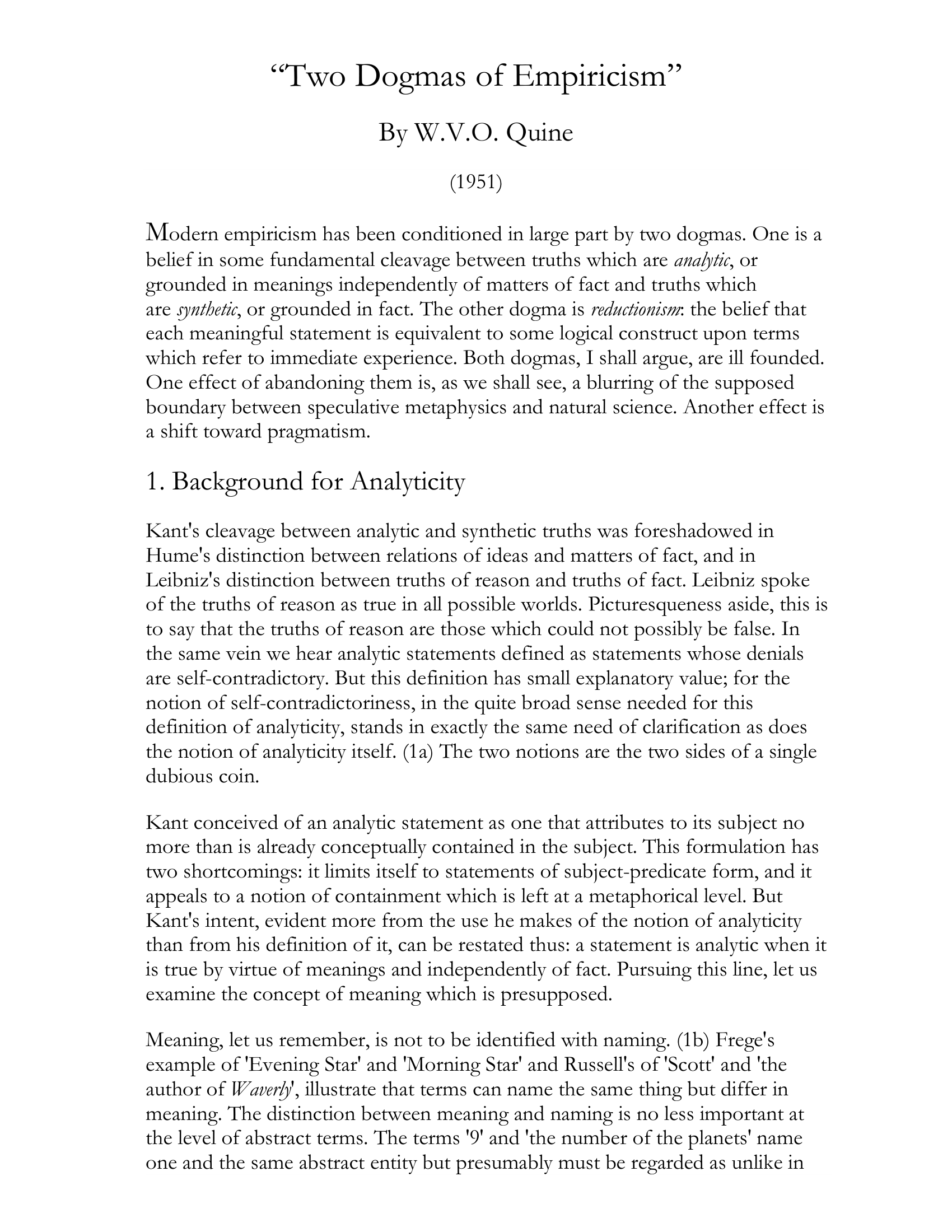콰인은 칸트의 이러한 정의가 훌륭한 직관을 담고 있지만, 두 가지 측면에서 논리적 결함을 지니고 있다고 지적합니다. 첫 번째는 칸트의 구분이 오직 주어와 술어의 형태로 이루어진 문장에만 제한된다는 형식적인 한계입니다. 두 번째는 한 개념이 다른 개념에 포함된다는 표현 자체가 다분히 비유적이고 모호하여 엄밀한 논리적 잣대로 쓰기 어렵다는 점입니다. 하지만 칸트의 이러한 직관은 의미라는 더 넓은 맥락으로 발전하여 후대 철학자들에게 계승됩니다. 칸트 이후의 철학자들은 분석 명제를 사실이나 경험적 세계에 의존하지 않고 오직 언어적 의미에 의해서만 참이 되는 명제로 재정의하기 시작했습니다.