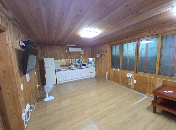 객실 내부에는 기본적인 편의시설이 완벽하게 갖춰져 있어요. 에어컨, TV, 냉장고, 전자레인지 등 필요한 가전제품들이 모두 있어서 집처럼 편안하게 이용할 수 있었죠. 특히 주방 시설이 잘 되어 있어서 좋았어요. 인덕션, 밥솥, 전기포트 등 조리 기구는 물론이고, 냄비, 프라이팬, 각종 식기류, 컵, 수저까지 넉넉하게 준비되어 있어서 따로 뭘 챙겨갈 필요가 없었답니다.