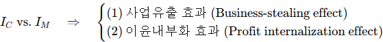 티롤 이론에 따르면, 경쟁적 시장의 R&D 투자 인센티브(Ic)와 독점적 시장의 R&D 투자 인센티브(IM)를 비교할 때, 다음 두 가지 효과를 고려해야 합니다: