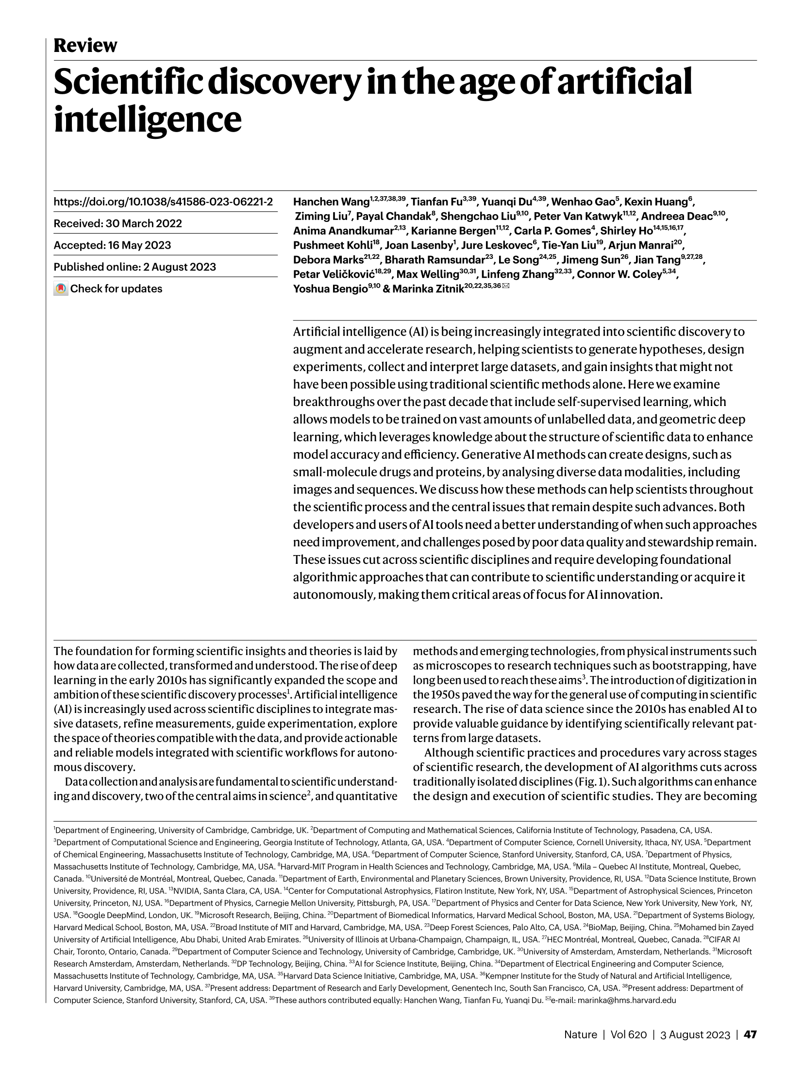 오늘 우리가 함께 깊이 파고들 텍스트는 2023년 네이처(Nature)에 실린 기념비적인 리뷰 논문, 바로 '인공지능 시대의 과학적 발견(Scientific discovery in the age of artificial intelligence)'입니다. 딥러닝의 대부라 불리는 요슈아 벤지오(Yoshua Bengio)를 비롯한 수많은 석학들이 참여한 이 논문은, AI가 어떻게 과학의 전 과정을 재정의하고 있는지를 보여주는 나침반과도 같습니다. 여러분은 혹시 밤하늘을 보며 우주의 비밀을 궁금해하신 적이 있으신가요? 혹은 우리 몸속 세포가 어떻게 춤을 추며 생명을 유지하는지 경이로움을 느껴본 적이 있으신가요? 과거에는 소수의 천재 과학자들만이 그 비밀의 문을 열 수 있었습니다. 하지만 이제 AI라는 새로운 파트너가 그 문을 활짝 열어젖히고 있습니다.